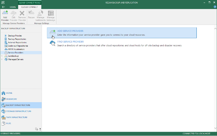 Select Backup Infrastructure -> Service Providers and select “Add Service Provider”