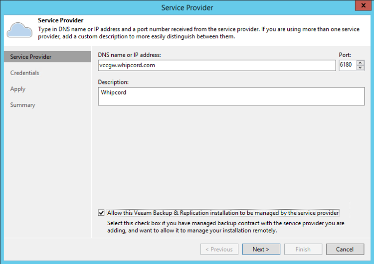 Use the value: vccgw.whipcord.com as the DNS name. Leave port 6180 as default. Select “Allow this Veeam Backup & Replication installation to be managed by the service provider”. This option allows more statistics and information to be brought into Whipcords Veeam Service Provider Console.