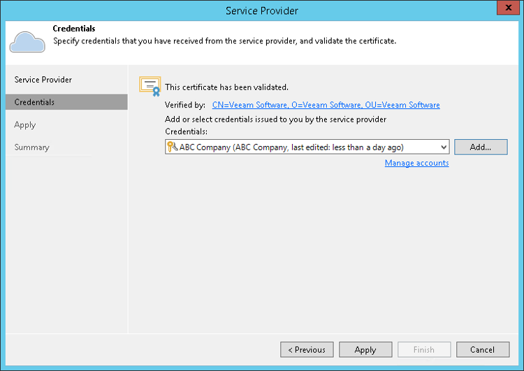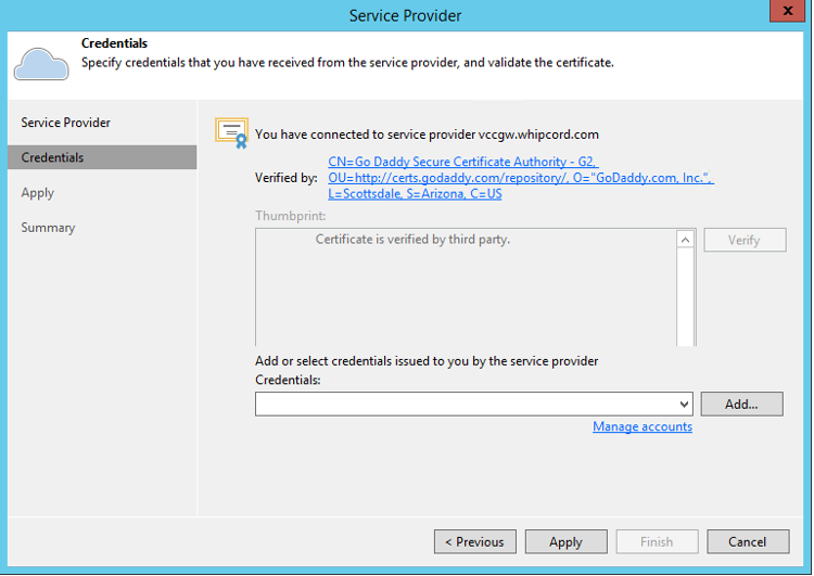Click Add to provide credentials to your Veeam Cloud Connect account with Whipcord.